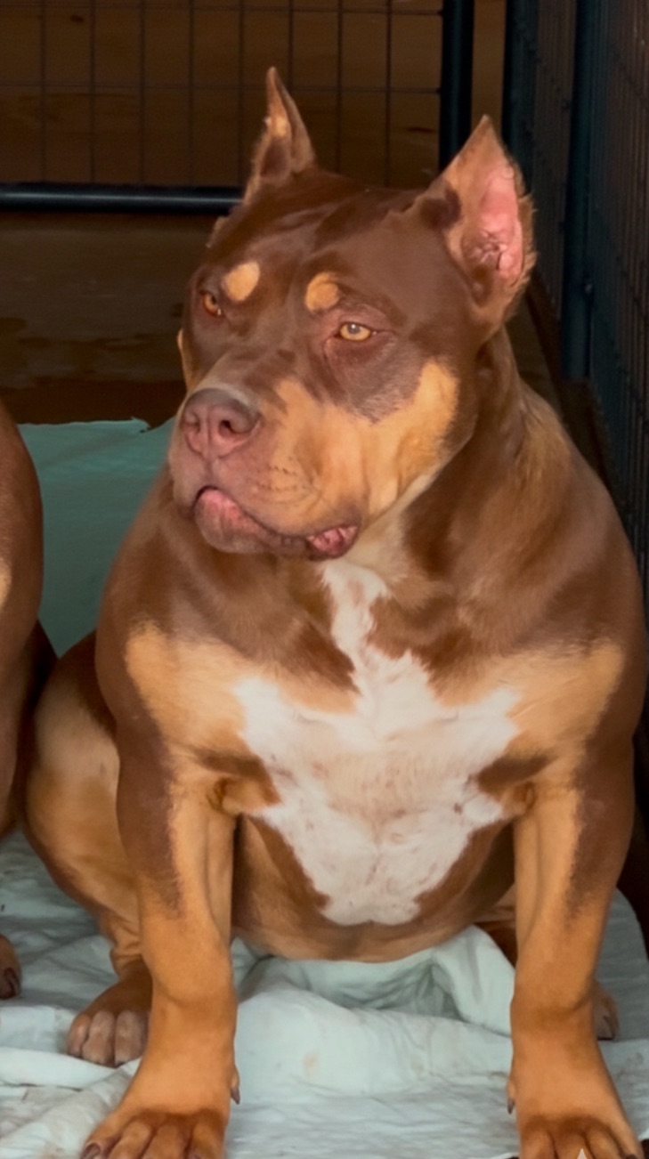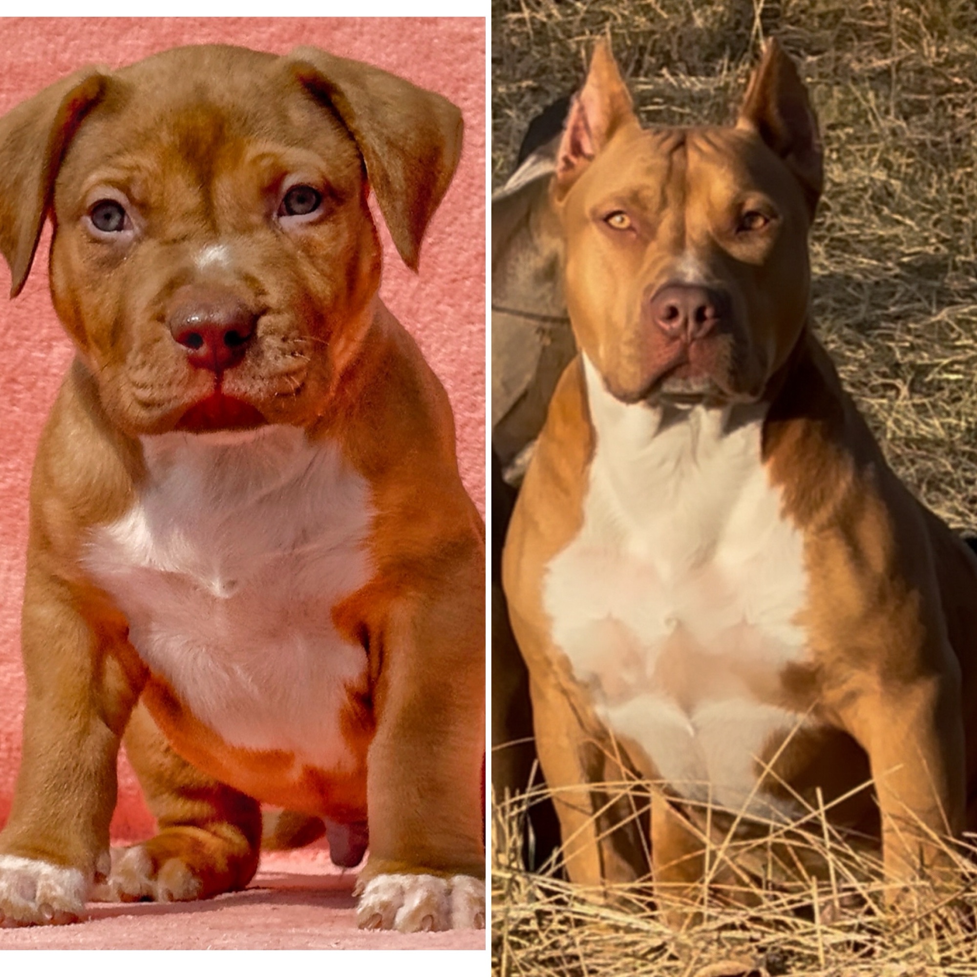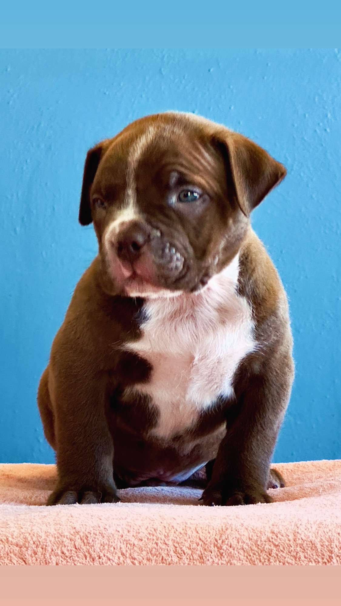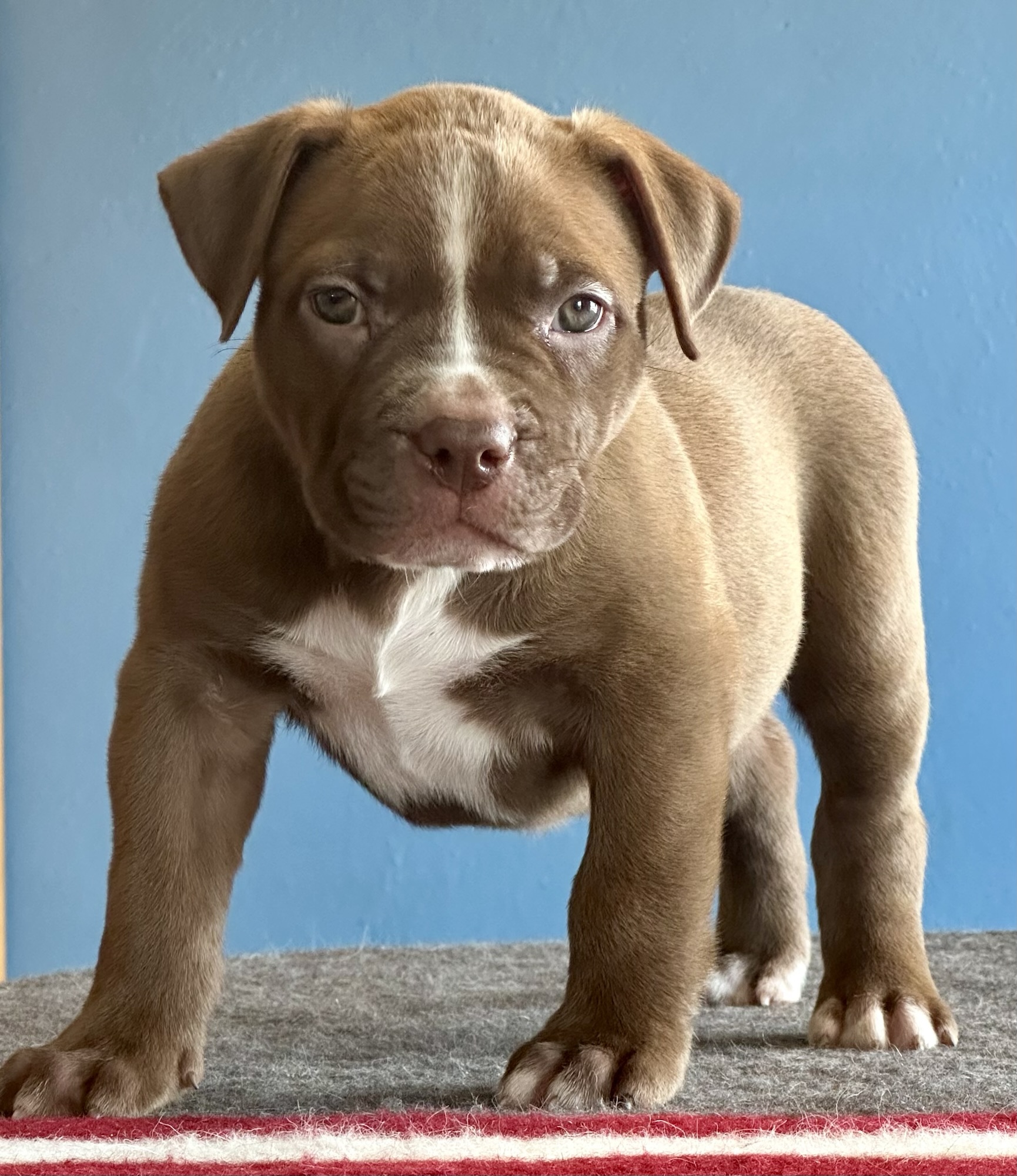 Taking after her father and grandfather in looks and build! The bulliest pup in the litter. She’s absolutely stunning – she is flawless!